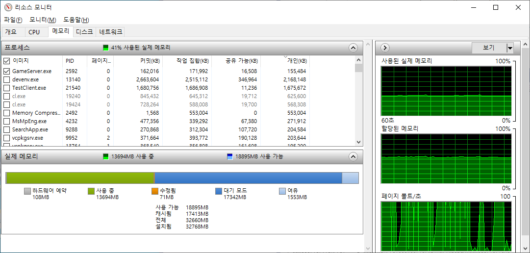 - 적용 후 Visual Studio 진단 도구의 메모리 스냅샷이 고장 발생함. 스탭샷 비교에 실제로 메모라가 증가했는데 변경이 없는것으로 나오고 스택등이 나오지 않음.